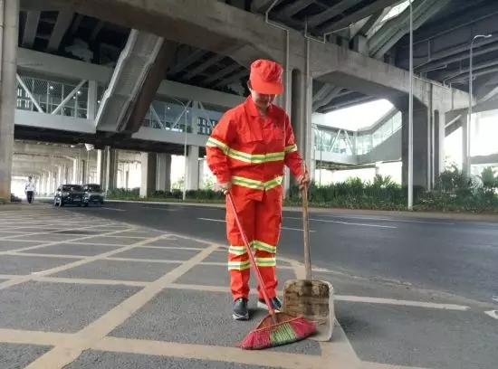 劉美所在的隊伍為三片區城西段早班,負責的片區是??跂|站到迎賓大道,這是三片區中人流、車流量最大的區域。節假日的時候,各種垃圾隨著人來車往從不間斷。1米5的劉美,拿著比她還要高的大掃把,開始掃夜晚留下的垃圾,從路的一頭望去,落葉在路面尤其明顯,劉美不停地打掃,掃把隨著劉美的節奏左右擺動。7點多,掃完第一遍時,劉美的臉早已紅撲撲,衣服也濕透了,劉美擦擦額頭的汗,又去巡檢。