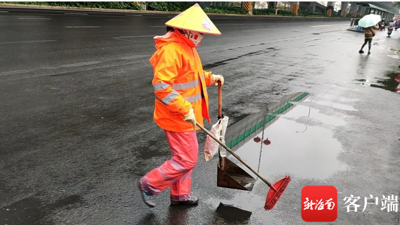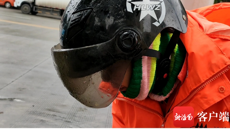 11日下午3點(diǎn),在海口金牛北路段,40歲的環(huán)衛(wèi)工吳揚(yáng)娣正在清掃路面上的枯枝葉等垃圾。因?yàn)閿?shù)小時(shí)在路面上走動(dòng)清掃,她呼吸出來(lái)的熱氣早已在安全帽上的擋風(fēng)片上凝結(jié)成一片朦朧的水珠。