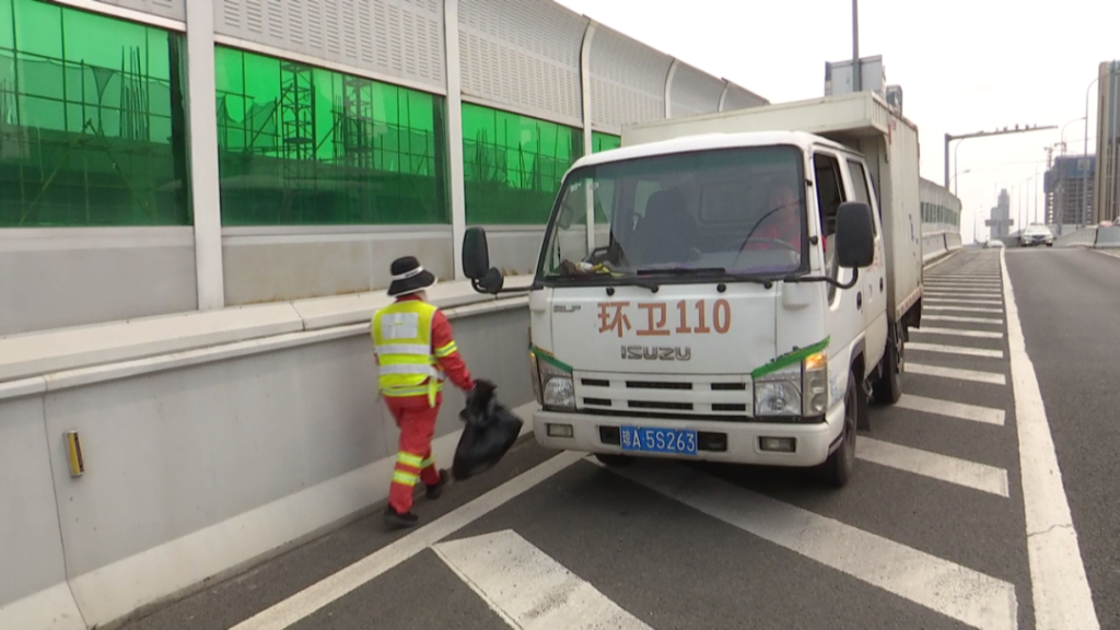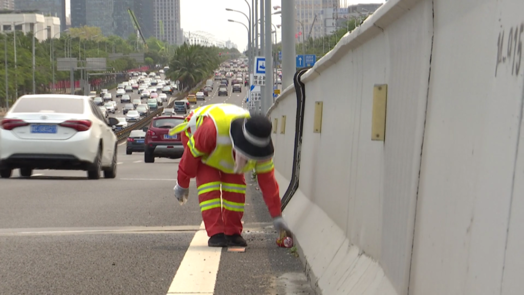垃圾太多,范圍太大的話,我們才用掃帚,一般都是拿手來撿,車流太多,馬上撿了,馬上就要走,不能在橋上停留。