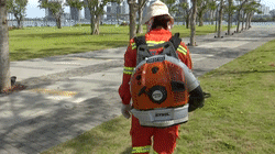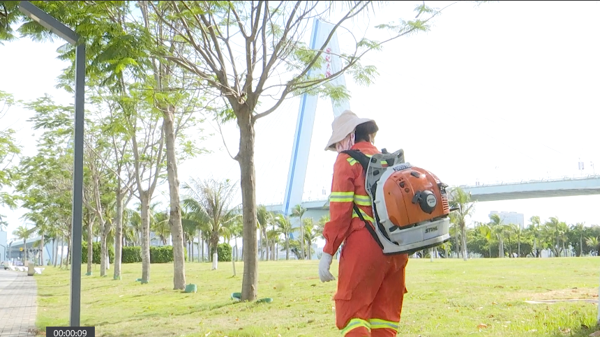 陳姣是海口龍馬環衛環境工程有限公司的一名環衛工人,主要負責草坪的清潔工作,每天工作將近6個小時,穿梭在草坪上,幾乎沒有遮陽的地方。天氣炎熱,陳姣使用吹風機,高效率地清除了草坪上的垃圾雜物。