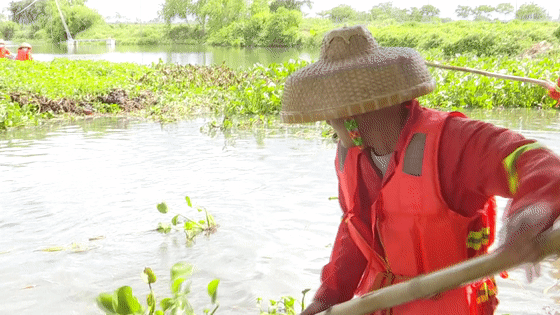 周乃順告訴記者說,推動水浮蓮不能用蠻力 ,需要善于觀察風向,順著風推,才會省時省力。值得注意的是,這水浮蓮是可以隨時順著水流“漂移”的,他與同事們經(jīng)常要沿著溝渠追趕 。在炎熱的夏季,要身著救生衣下水作業(yè),不到一會兒就大汗淋漓。