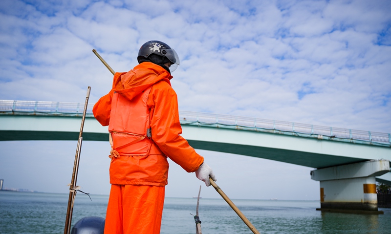 龍珠灣到世紀(jì)大橋的水域岸坡邊上我們看到一群穿著橘色工作服及救生衣,頭戴棉帽,手戴棉手套在寒風(fēng)中打撈作業(yè)的海上環(huán)衛(wèi)工人。