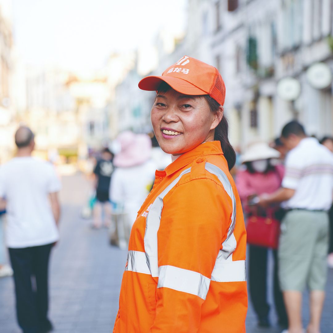 望著、努力著。她是福龍馬海口公司一片區(qū)解放段隊長林景月,始終堅持一步一個腳印,干一行愛一行,見證了解放西的發(fā)展,守護著老街的干凈整潔。