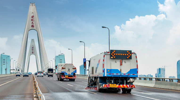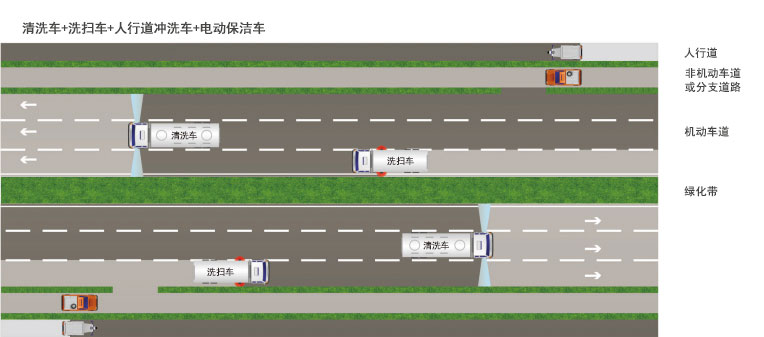 使用洗掃車(chē)(掃路車(chē))、沖洗車(chē)(灑水車(chē))等機(jī)械對(duì)路面進(jìn)行機(jī)掃以及噴灑、沖洗作業(yè); 使用路面養(yǎng)護(hù)車(chē)對(duì)果皮箱、油污路面進(jìn)行清洗保潔。